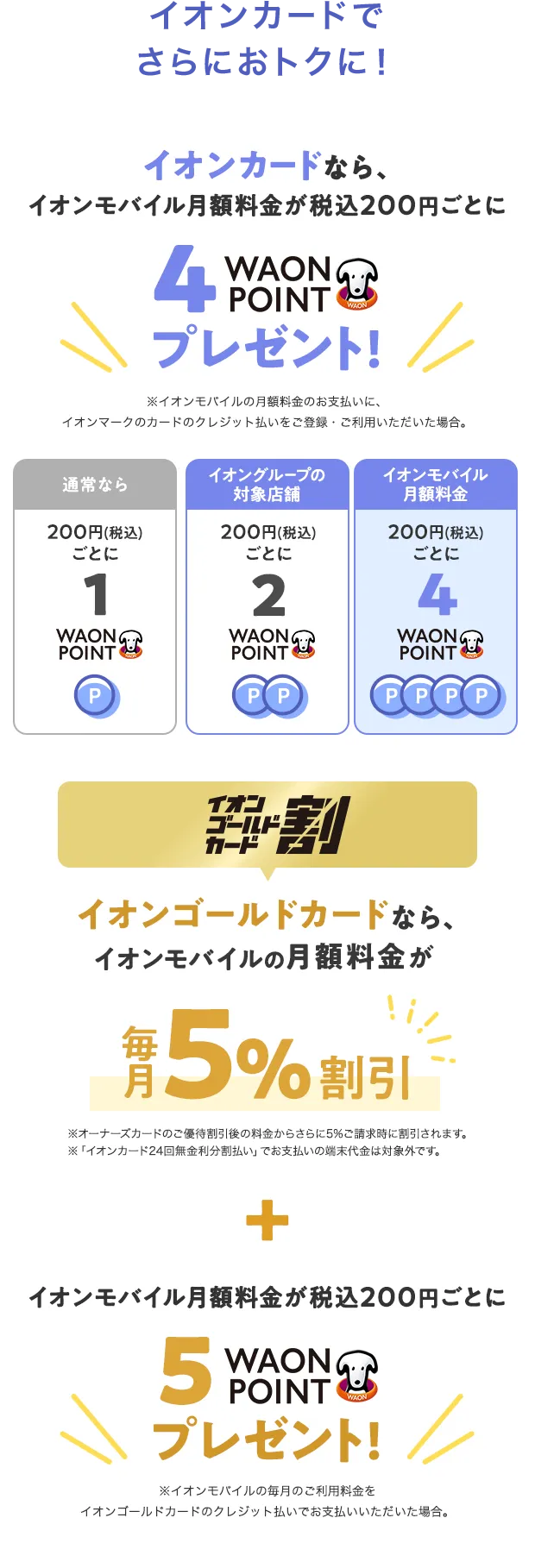 - ※イオンモバイルの月額料金をイオンカードでお支払いの場合は基本の4倍(税込200円ごとに4WAON POINT)、イオンゴールドカードでお支払いの場合は基本の5倍(税込200円ごとに5WAON POINT)を進呈します。
