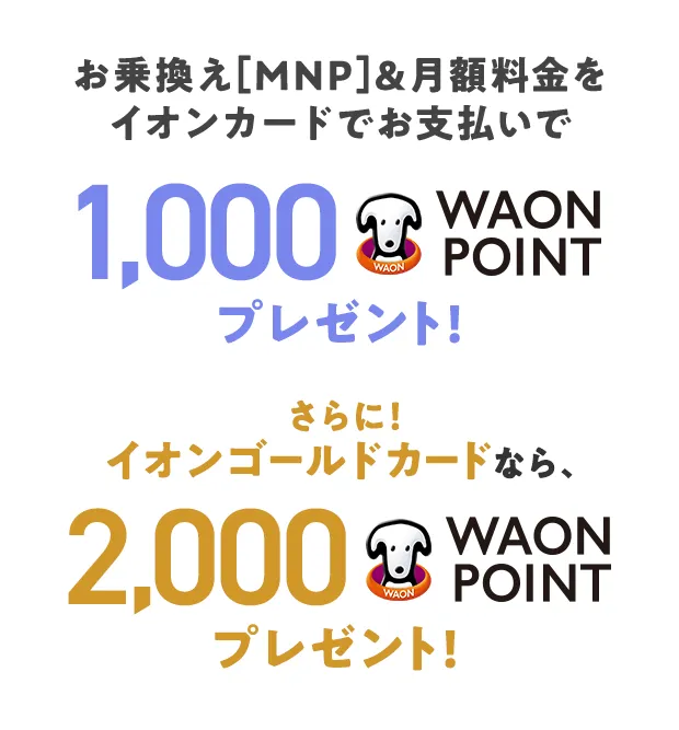イオンマークのカードの種類WAON POINT イオンカード 1,000ポイント イオンゴールドカード 2,000ポイント - お乗換え(MNP)をともなわない新しい電話番号でご契約や、データ通信専用のSIMカードのご契約は、本キャンペーンの対象とはなりません。